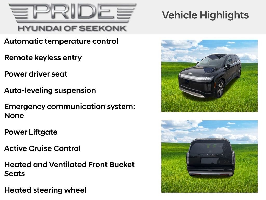 Elevate your driving experience with the 2026 Hyundai IONIQ 9 SEL. This exceptional electric vehicle combines cutting-edge technology, uncompromising comfort, and a bold, distinctive style that is sure to turn heads. Visit our showroom today and discover the power of the IONIQ 9 for yourself. Price includes: $10000 - Retail Bonus Cash. Exp. 02/02/2026