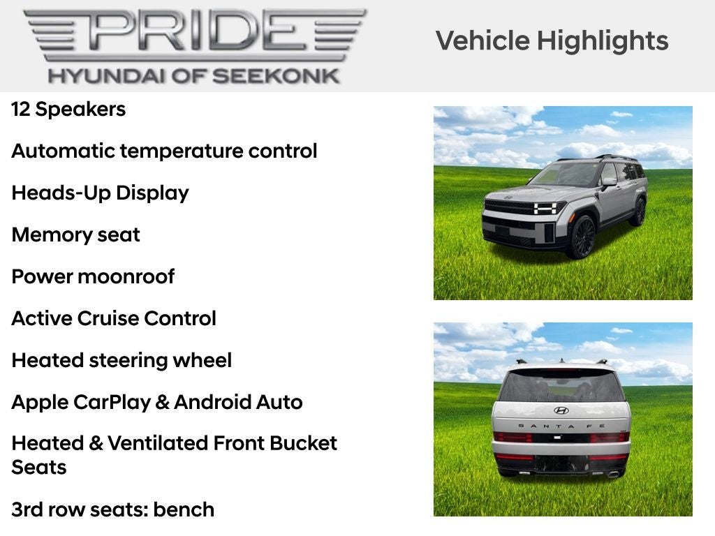Whether navigating the daily commute or embarking on a weekend getaway, the 2026 Hyundai Santa Fe Calligraphy is the ultimate expression of refined SUV capability. Experience the difference for yourself and schedule a test drive today. We're confident you'll be impressed by the exceptional value and uncompromising quality of this remarkable vehicle. Price includes: $1500 - Hyundai HMF Dealer Choice : $1500 discount and 5.39% APR for 24 months. $44.05 per $1000 financed. Available to well qualified buyers who finance through Hyundai Motor Finance. H704. Exp. 02/02/2026