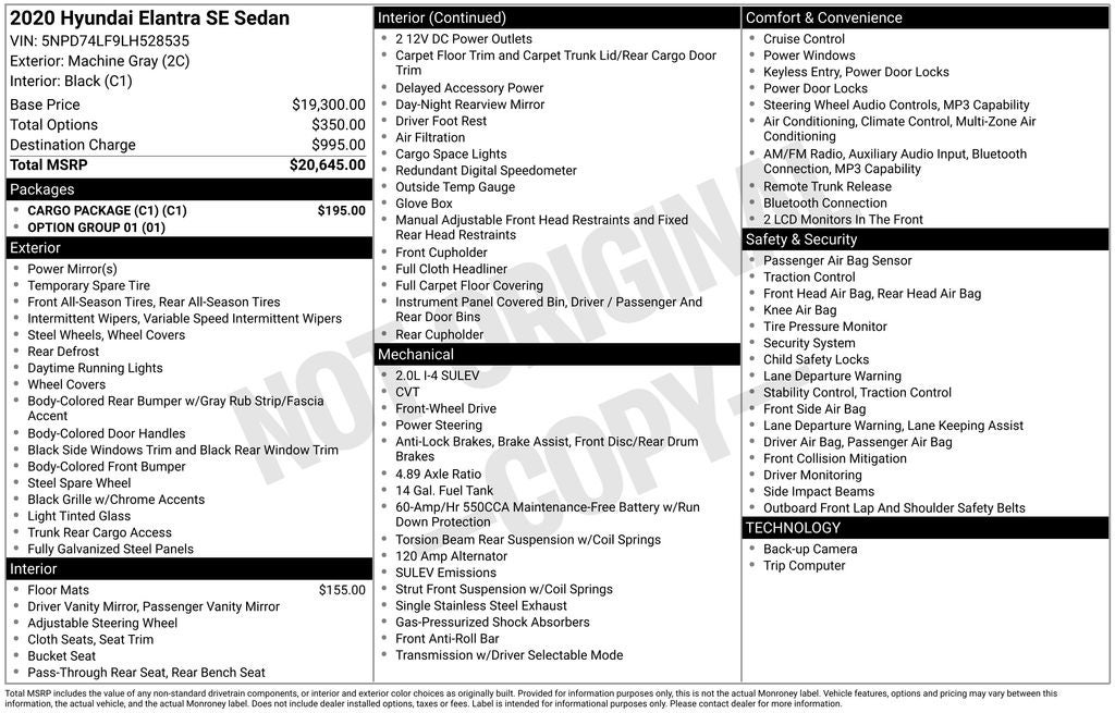 This online window sticker is provided for informational purposes only. Vehicle features, options, pricing and other information are subject to change. See your Hyundai dealer and the Monroney label affixed to the actual vehicle for the most up-to-date specifications and information.