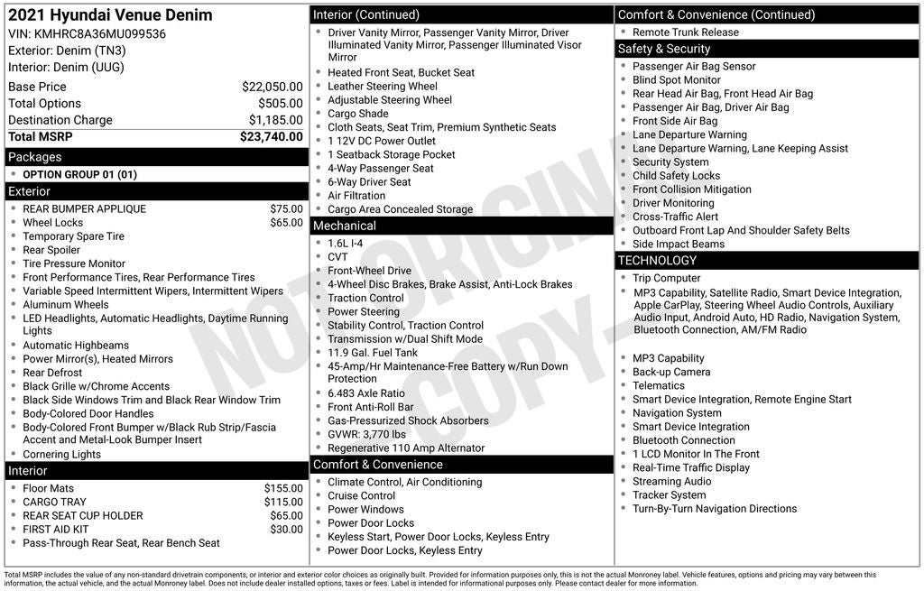 This online window sticker is provided for informational purposes only. Vehicle features, options, pricing and other information are subject to change. See your Hyundai dealer and the Monroney label affixed to the actual vehicle for the most up-to-date specifications and information.