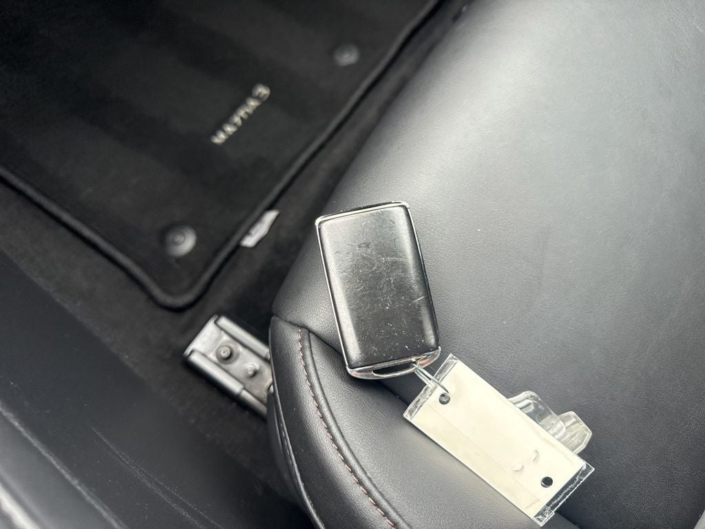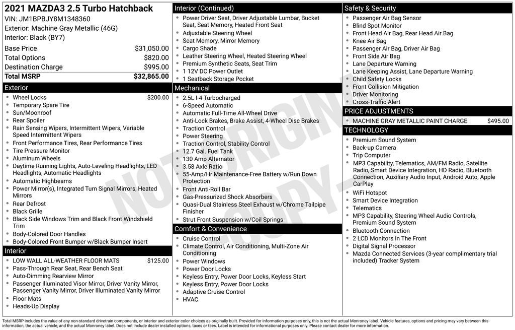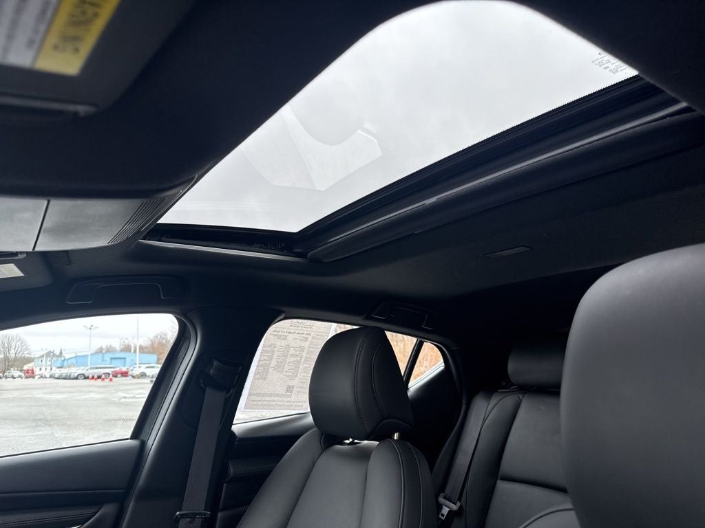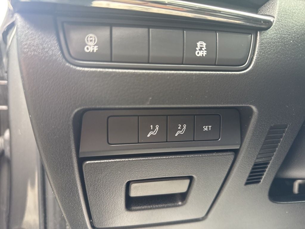 Vehicle is equipped: 12 Speakers, 4-Wheel Disc Brakes, ABS brakes, Air Conditioning, Alloy wheels, AM/FM radio: SiriusXM, AppLink/Apple CarPlay and Android Auto, Auto High-beam Headlights, Auto-dimming Rear-View mirror, Automatic temperature control, Black Lug Nuts & Black Wheel Locks, Brake assist, Bumpers: body-color, Compass, Delay-off headlights, Driver door bin, Driver vanity mirror, Dual front impact airbags, Dual front side impact airbags, Electronic Stability Control, Emergency communication system: MAZDA CONNECT, Exterior Parking Camera Rear, Front anti-roll bar, Front Bucket Seats, Front Center Armrest, Front dual zone A/C, Front reading lights, Front wheel independent suspension, Fully automatic headlights, Heads-Up Display, Heated door mirrors, Heated front seats, Heated Front Sport Seats, Heated steering wheel, Illuminated entry, Knee airbag, Leatherette Seat Trim, Low tire pressure warning, Low Wall All-Weather Floor Mats, Machine Gray Metallic Paint Charge, Memory seat, Occupant sensing airbag, Outside temperature display, Overhead airbag, Overhead console, Panic alarm, Passenger door bin, Passenger vanity mirror, Power door mirrors, Power driver seat, Power moonroof, Power steering, Power windows, Radio data system, Radio: AM/FM Audio System, Rain sensing wipers, Rear seat center armrest, Rear window defroster, Rear window wiper, Remote keyless entry, Speed control, Speed-sensing steering, Split folding rear seat, Spoiler, Steering wheel mounted audio controls, Tachometer, Telescoping steering wheel, Tilt steering wheel, Traction control, Trip computer, Turn signal indicator mirrors, Variably intermittent wipers, and Wheels: 18 x 7J Black Finish Alloy.
