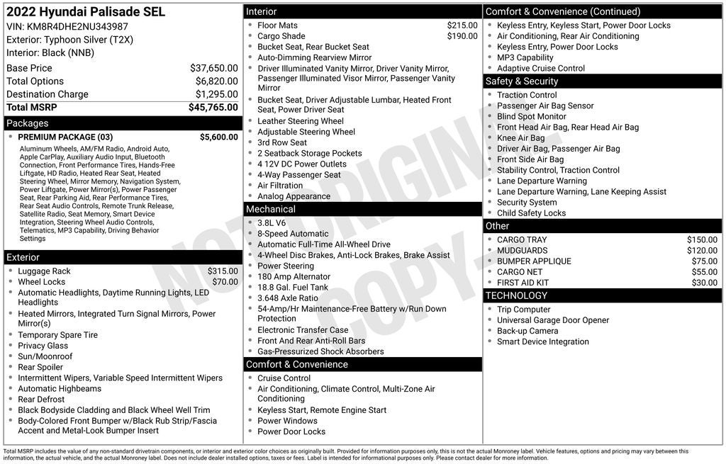 This online window sticker is provided for informational purposes only. Vehicle features, options, pricing and other information are subject to change. See your Hyundai dealer and the Monroney label affixed to the actual vehicle for the most up-to-date specifications and information.