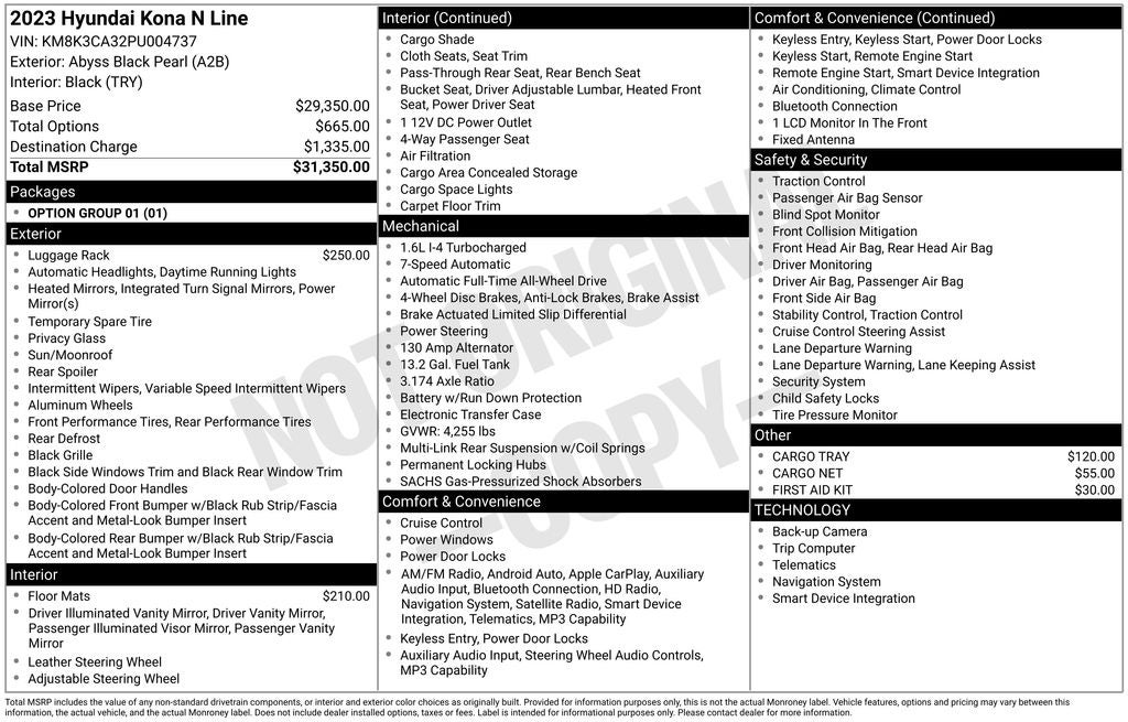This online window sticker is provided for informational purposes only. Vehicle features, options, pricing and other information are subject to change. See your Hyundai dealer and the Monroney label affixed to the actual vehicle for the most up-to-date specifications and information.