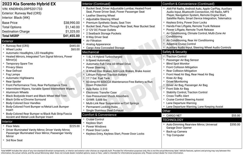 2023 Kia Sorento Hybrid EX 1.6L I4 DGI Hybrid Turbocharged DOHC 16V LEV3-ULEV70 Runway Red CARFAX One-Owner. 36/33 City/Highway MPG